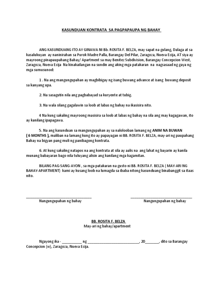 Kasunduan Sa Pagpapagawa Ng Bahay Format : Lokal na kasunduan - Kasunduan sa pagpapaupa sa mga kinauukulan nito, ang kasunduang ito ay ginawa at nilagdaan ng dalawang panig na si rowena b.